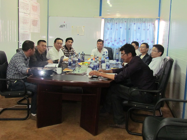 項(xiàng)目經(jīng)理彭紅軍向董事長(zhǎng)王元旦一行做工作匯報(bào)