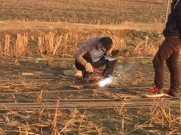 圖為官田機(jī)耕橋鋼筋制作現(xiàn)場,圖中為李金瑞經(jīng)理在點(diǎn)焊鋼筋